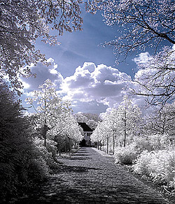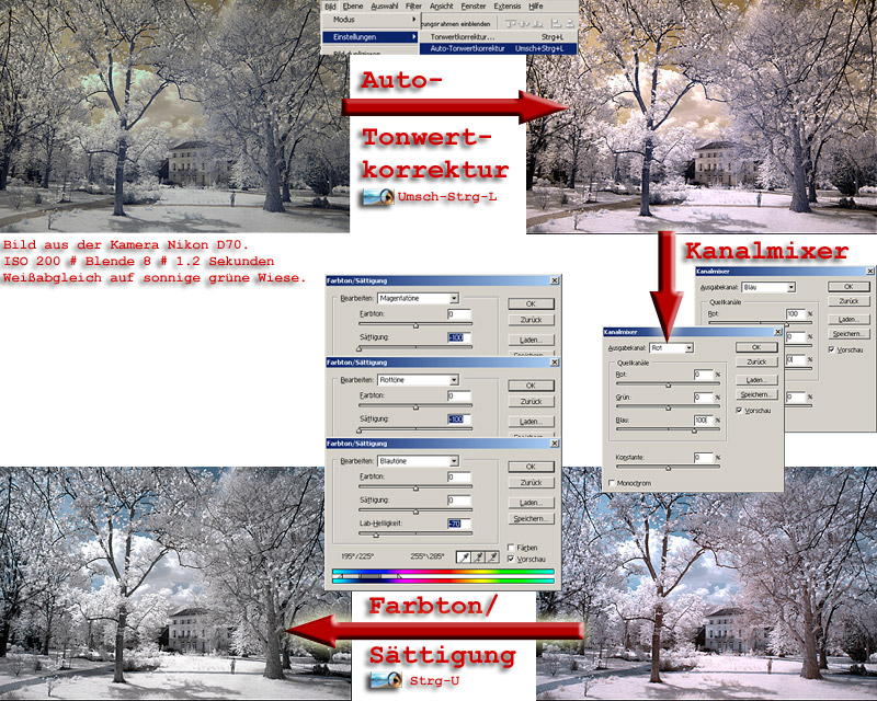 Bearbeitung: Farb-Infrarot Wie bereits im ersten Teil erwähnt, sind für die Erstellung von Farb-Infrarotaufnahmen zwei Dinge zu beachten. Es muß ein ordentlicher Weißabgleich gemacht werden und es sollte ein schwacher IR-Filter benutzt werden. Dann kann man zum Beispiel Aufnahmen mit schneeweißen Bäumen und blauem Himmel gestalten. Ich werde nun anhand eines Beispiels erklären, wie man ein solches Ergebnis erhält. Es empfiehlt sich später mit verschiendenen Einstellungen zu experimentieren, da sich ganz unterschiedliche Ergebnisse auch stark abhängig vom Ursprungsbild erzielen lassen. Oft wird man auch mit der Anleitung nicht gleich zu einem optimalen Ergebnis gelangen dann unbedingt weiter probieren und andere Einstellungen testen! Nach dem Laden in Photoshop (oder ein Bildbearbeitungsprogramm mit vergleichbaren Funktionen) wird eine Auto-Tonwertkorrektur durchgeführt (ggf. manuell). Danach wird ein Kanaltausch im Kanalmixer gemacht: