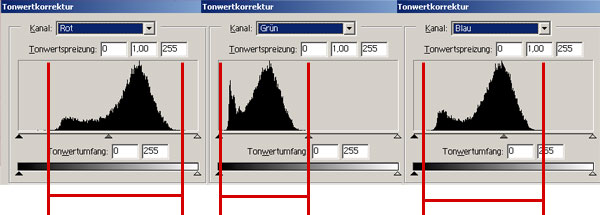 Bearbeitung Meistens läßt sich die Kamera nicht so einstellen, daß am Ende bereits das ideale Infrarot-Bild herauskommt. Daher liegt ein besonders Augenmerk auf der Nachbearbeitung, dem Postprocessing. Es gibt verschiedene Möglichkeiten der Nachbearbeitung. Meist steht am Beginn eine Optimierung der Tonwertkurve (z.B. Autotonwert-Korrektur ![]() Bearbeitung: S/W Infrarot Am einfachsten ist die Nachberarbeitung für S/W Infrarot Bilder. Oft reicht für diese Aufnahmen der automatische Weißabgleich der Kamera um daraus in der Bearbeitung ein gutes Resultat zu erzielen. Im Bildbearbeitungsprogramm wird zuerst die Tonwertkurve korrigiert. Wenn kein optimaler Weißabgleich gemacht wurde, sind die Tonwerte für den roten Kanal meist korrekt, aber für Grün und Blau müssen die Werte gespreizt werden. Das übernimmt sehr zuverlässig die automatische Tonwertkorrektur. Wer möchte, kann aber auch manuell jeden einzelnen Farbkanal korrigieren (siehe unten). Nach der Korrektur muß das Bild nur noch in s/w gewandelt werden, z.B. durch das Verringern der Farbsättigung ( ![]() ![]() Abb. 7: Tonwertspektren der Aufnahme in Abb.6a |
